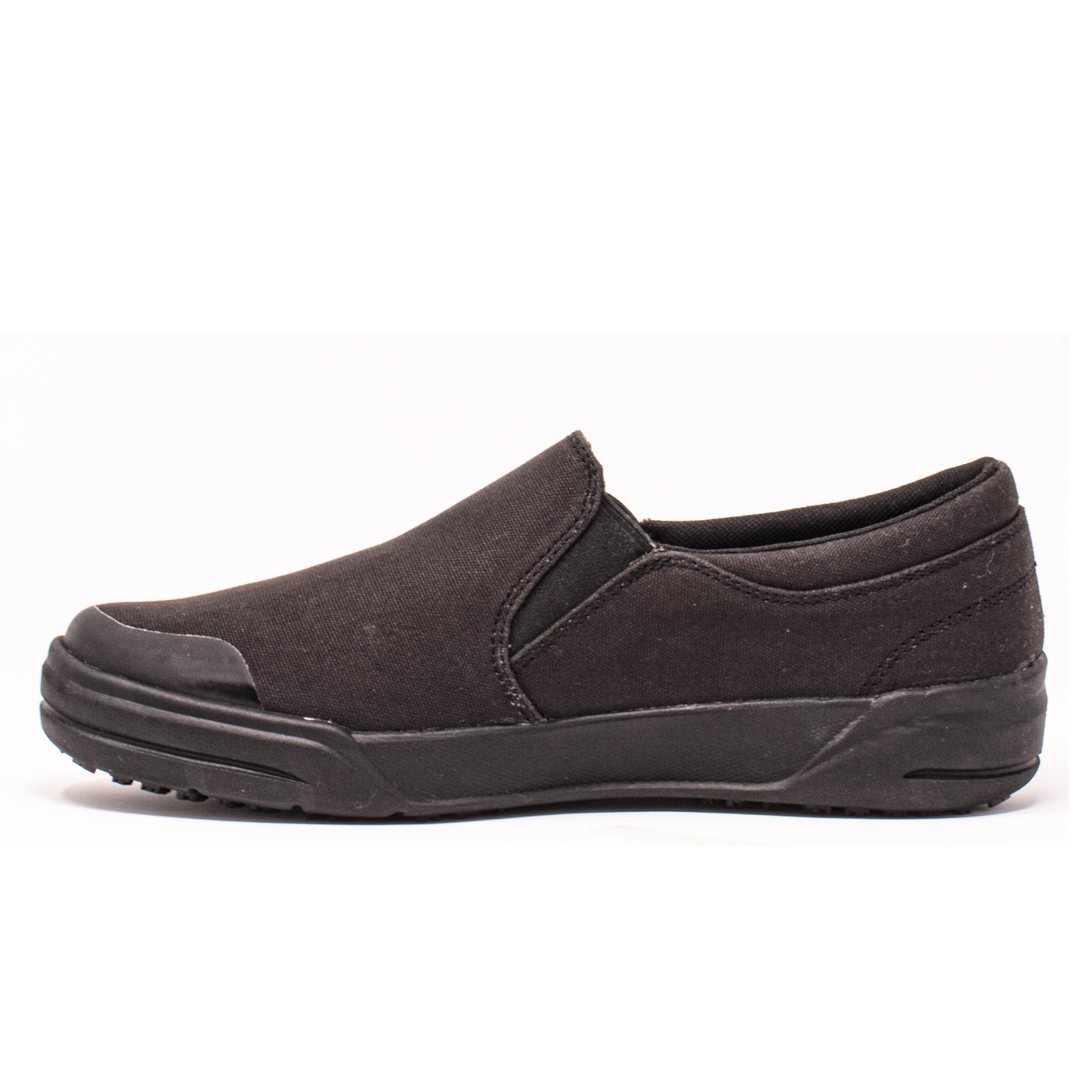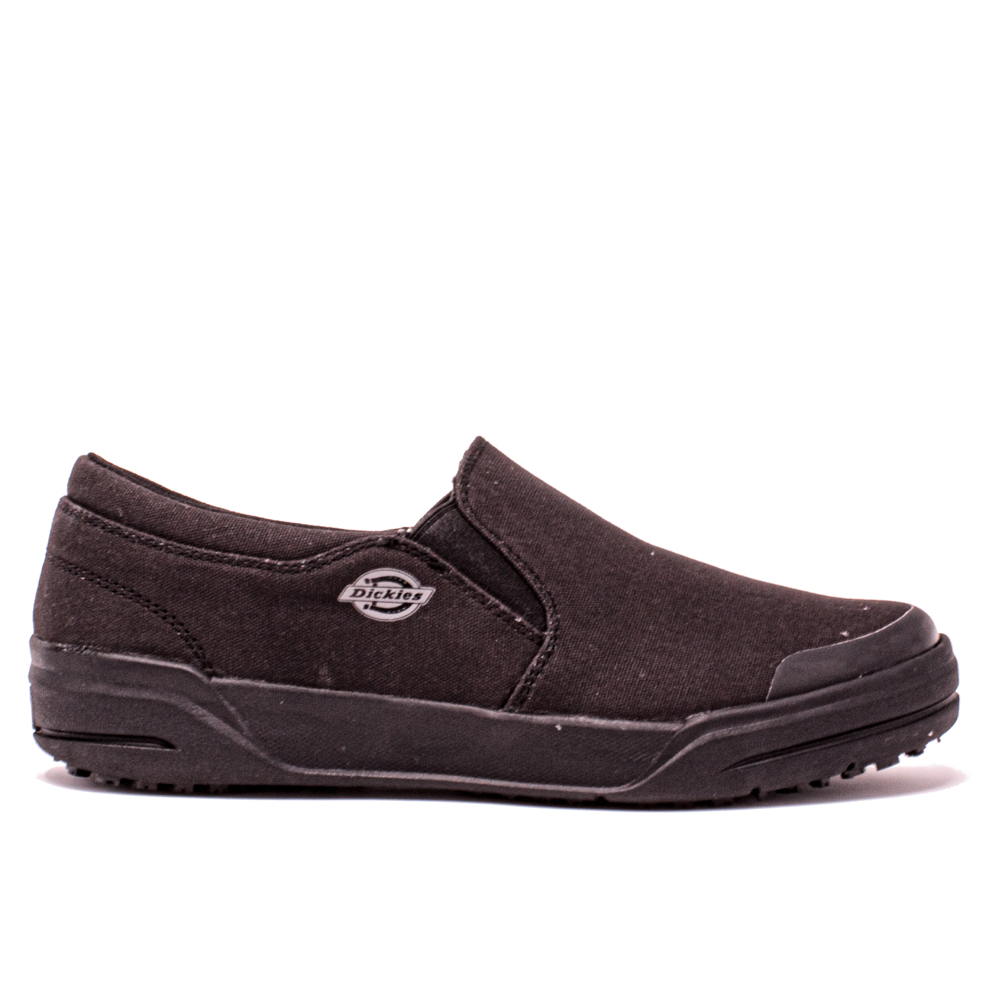 The men’s Supa Dupa by Dickies is a skate-inspired, lightweight slip-on work shoe with slip-resisting outsole and protective toe. This all-black slip-on work shoe has a 10-ounce, industrial-grade black canvas upper with lace up design to hold feet securely in place. A molded rubber toe in conjunction with a steel safety toe cap resists scuffs and meets ASTM requirements for impact and compression protection. The rubber outsole with Treadlock™ pattern grips surfaces; the Dickies® Flex outsole grooves allow this shoe to bend and move with you. Inside feet rest upon a removable OrthoLite® footbed. These lightweight, convenient shoes are compliant and comfortable.